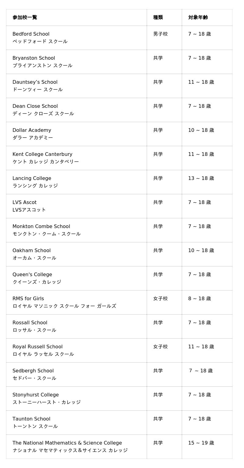 共学、男子、女子の小学校(プレップスクール)から中高一貫校(シニアスクール)まで、幅広い層を対象にした18校。会場では18校の代表者が、サマースクールからGCSEコース、Aレベル、IB、奨学金入試に至るまで、多彩な留学プログラムについて直接ご相談をお受けします。
