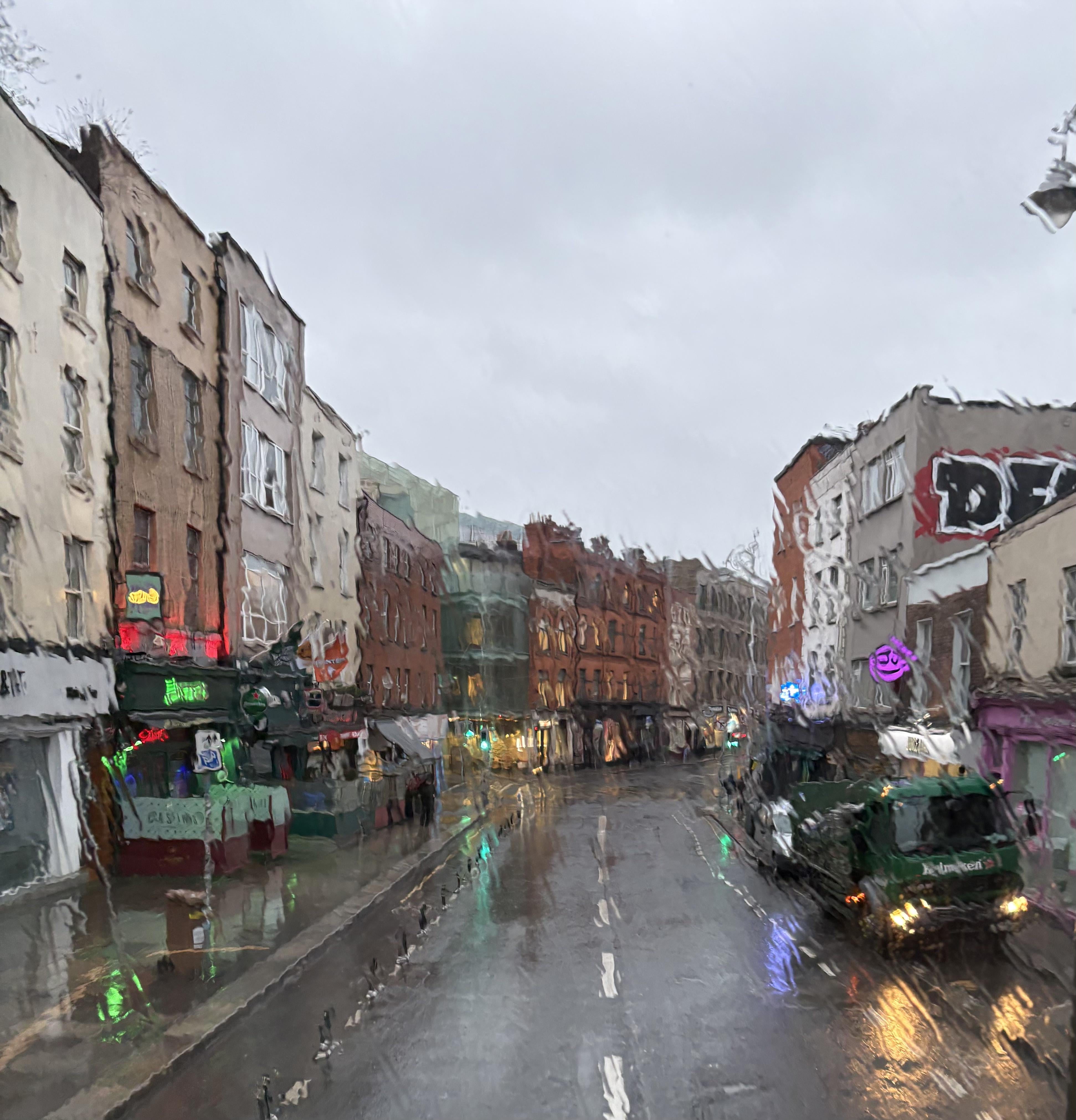 ダブリンのバスの窓に雨が降って街が油絵になった