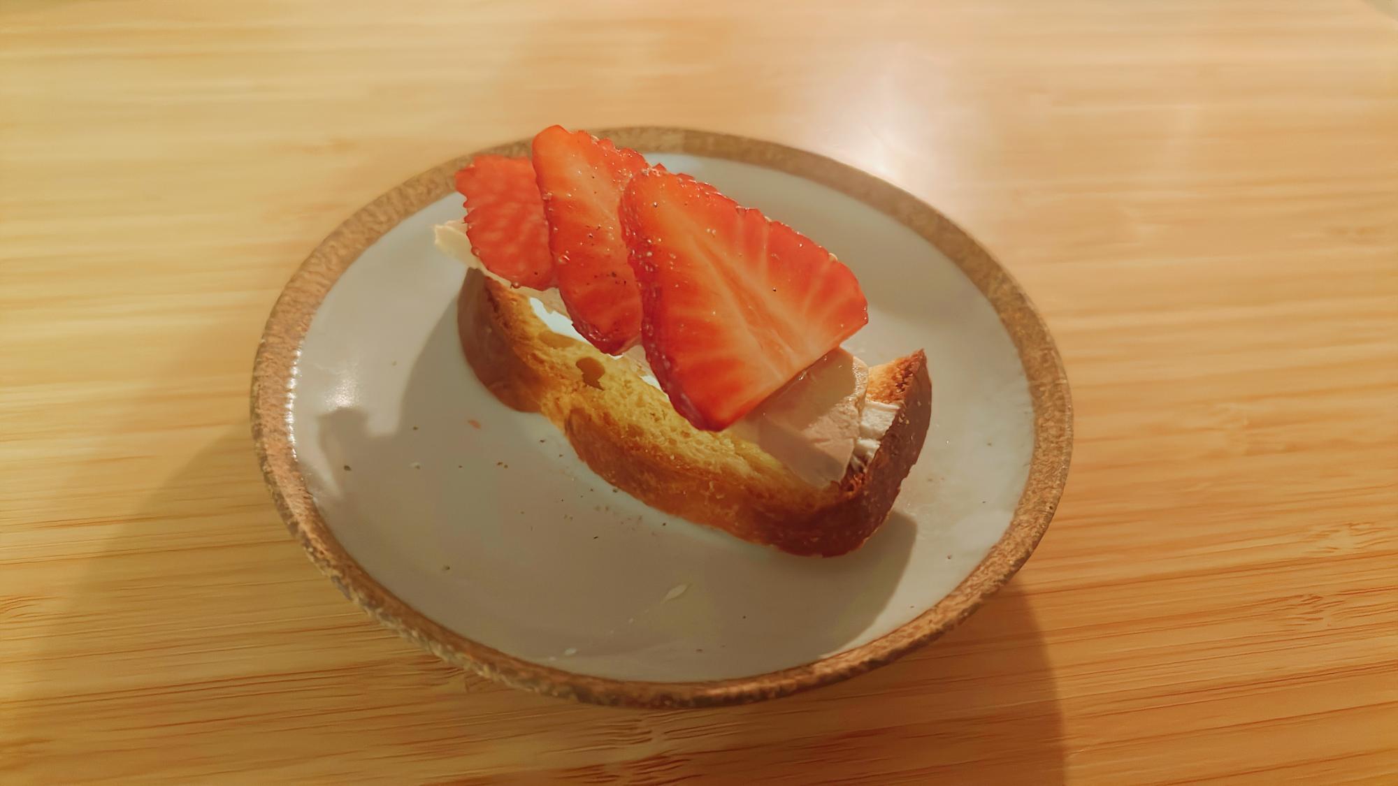 ほんのり甘いパンにフォアグラといちごがのったかわいい一皿で、いちごの甘さに驚きました。