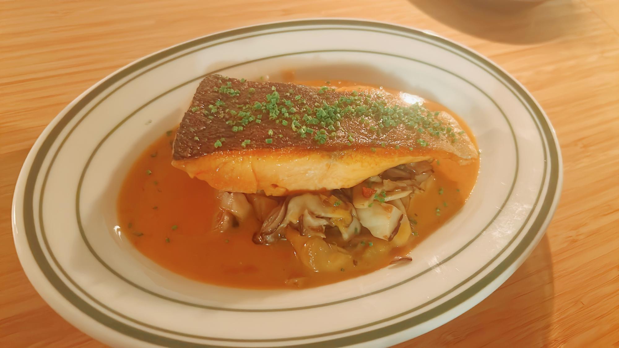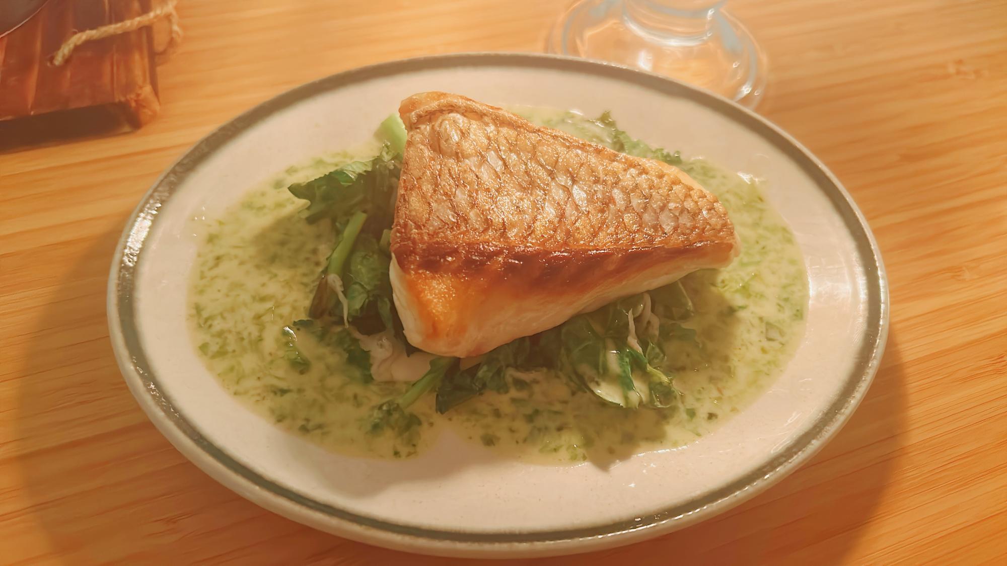 皮目がパリパリの焼かれた鯛はふっくらジューシーで、なばなとシラス、青のりのソースは和洋折衷の一風変わった味ながら止まらないおいしさでしたよ。