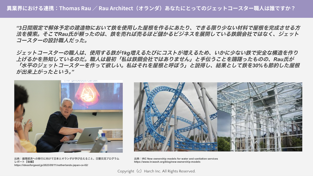 既存の商習慣や業界の常識にとらわれないパートナーシップの重要性を示すため、加藤はオランダの建築家トーマス・ラウ氏のエピソードに触れた。ラウ氏がある建物の屋根を作る際、可能な限り鉄の使用量を減らしたいと考えた。しかし、鉄骨会社に依頼すれば、彼らは鉄を売ることが商売であるため、多くの鉄を使う提案をしてくる。