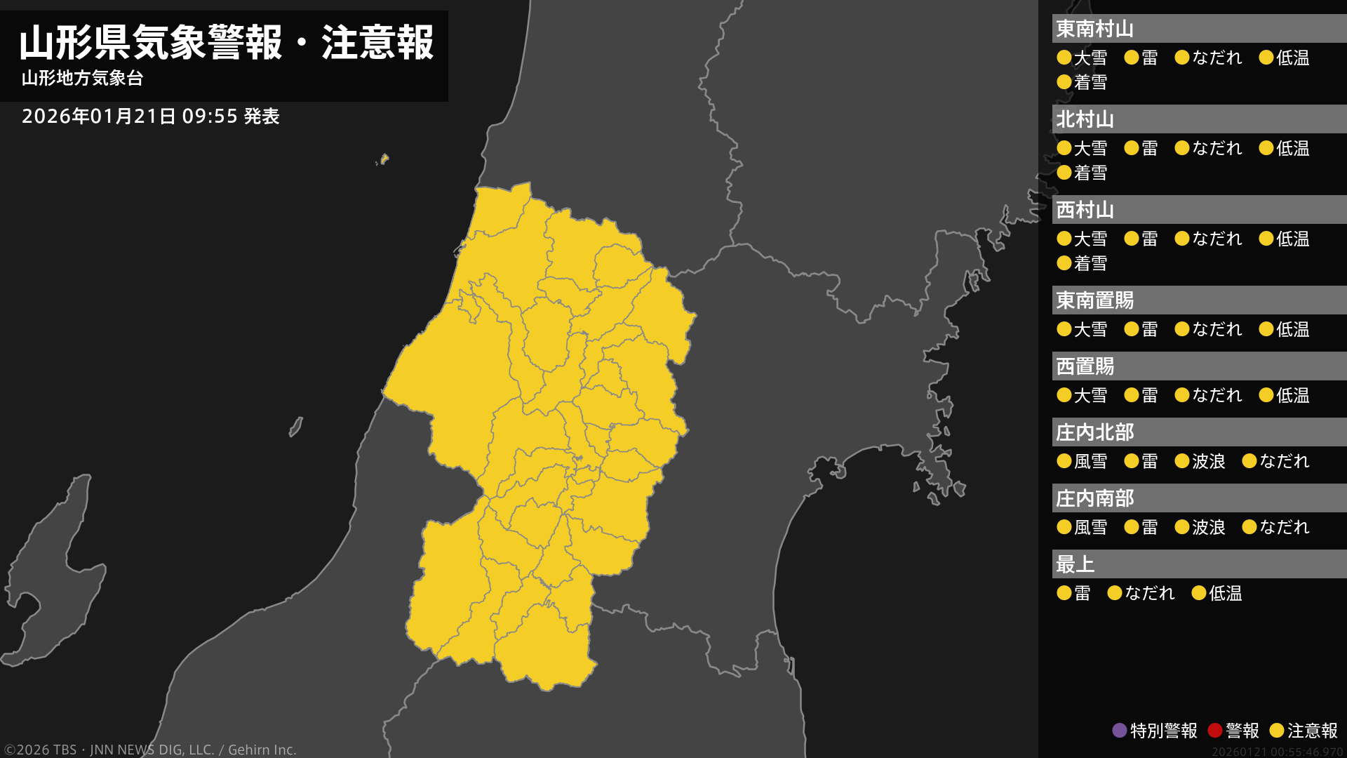 【なだれ注意報】山形県・鶴岡市、酒田市、庄内町、遊佐町に発表(雪崩注意報) 21日09:55時点