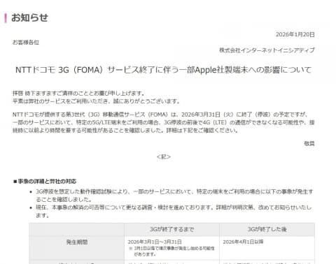 FOMAは3月31日をもって停波するが、これを前後にiPhone端末が4G通信できなくなる可能性や、接続に時間を要する可能性があることを確認したという。
