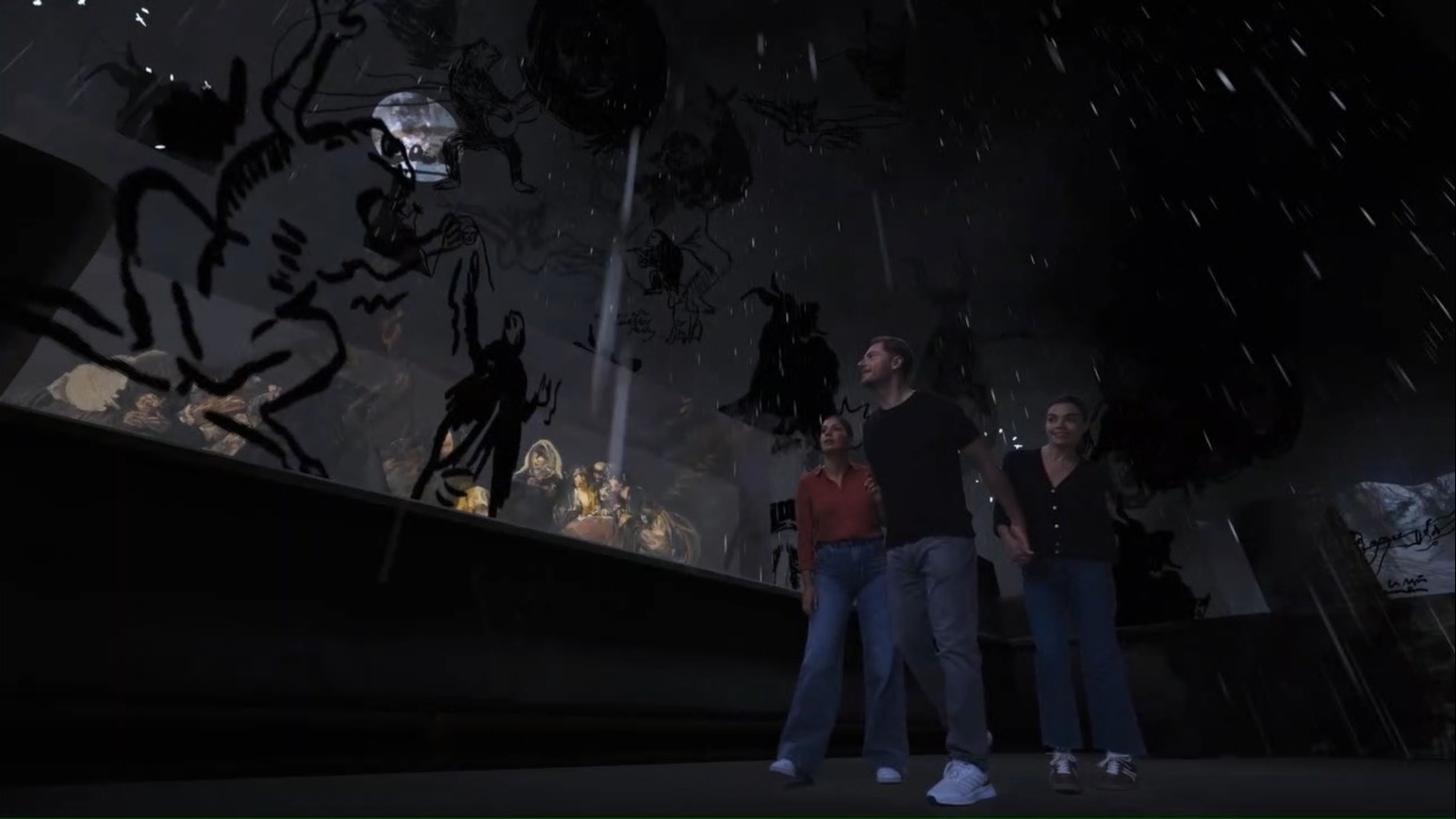 中でも、ゴヤの「魔女の安息日」はVRならではの見どころがあると感じた。これは、「黒い絵」と呼ばれる、彼が住んでいた家の壁面に油彩で描かれた14の作品のひとつ。現在では14作品すべてがそれぞれ独立した絵としてプラド美術館に所蔵されているが、本体験では、実際に壁画として描かれた時の様子を体験することができる。
