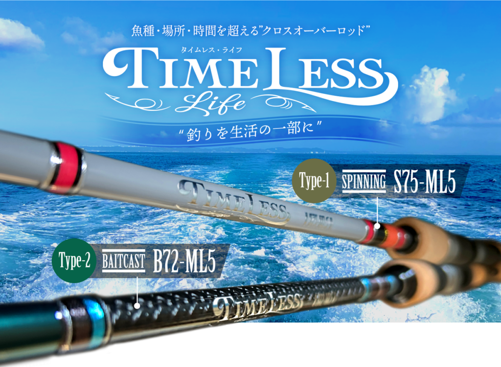 アングラー側が定めた魚種、フィールド、釣り方を1本のロッドで楽しめる超万能ロッド「タイムレス・ライフ」もラインナップ。7ft5inのスピニングモデル&7ft2inのベイトモデルの2機種が展開されており、ベリーからティップは比較的マイルドで、軽量ルアーでもシッカリ飛ばすことができ、バット部は粘り強く相手に主導権を与えない強靭仕様。両機種共に携行性に優れる5ピースモデル。