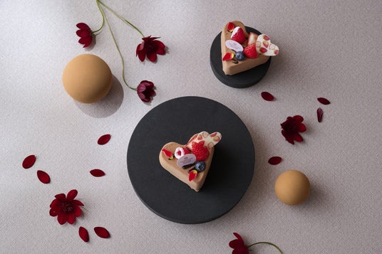 可愛らしいハート型が目を引く、バレンタインシーズンにぴったりのスイーツです。なめらかなチョコレートムースに、上品なフランボワーズの風味が広がります。トップにあしらったいちご、ブルーベリー、フランボワーズが、全体を華やかに彩ります。