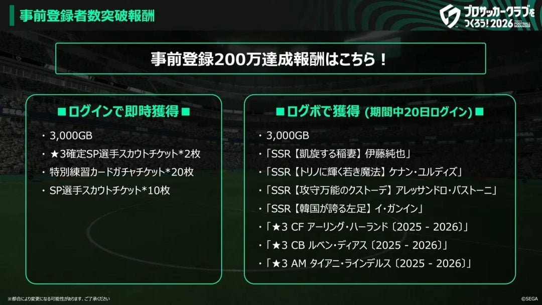番組内では、事前登録の報酬内容があらためて発表された。ログインボーナスで日本代表で活躍する伊東純也選手がもらえるほか、アーリング・ハーランド選手やルベン・ディアス選手といった『サカつく2026』とコラボしたマンチェスター・シティFCの主力選手がもらえるという大盤振る舞いといっていいものだ。ガチャを回せるチケットももらえるため、ガチャ運がいい場合はゲーム序盤からかなり強い選手を獲得することができるだろう。
