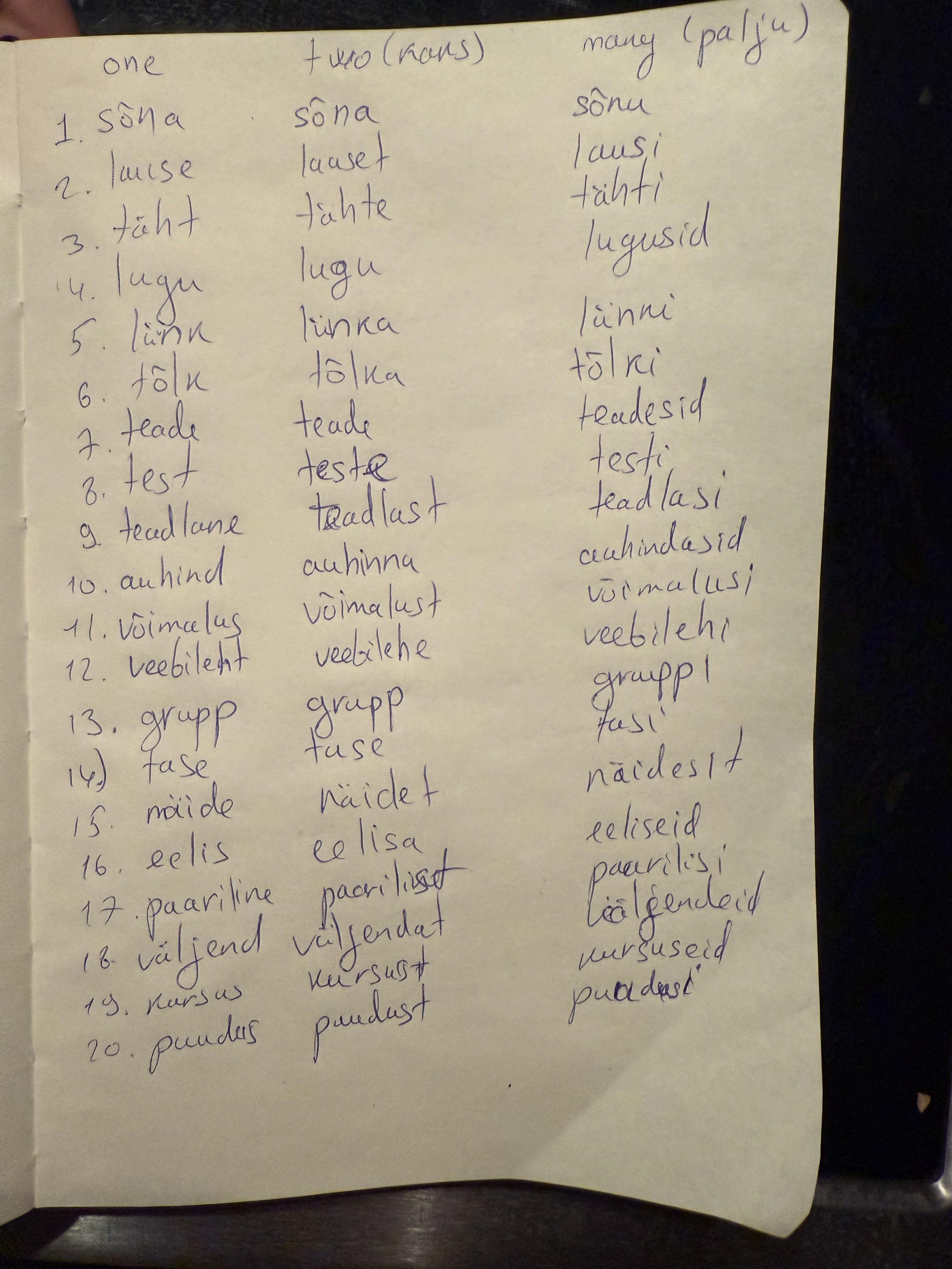 私の知る限り、外国人がエストニア語で新しい単語を学ぶときに知っておくべきこと 3 異なるケース: Nimetav、omastav、osastav。写真は、1 (nimetav)、2 (osastav が必要)、多く – palju (複数形の osastav) と言うべき単語を書こうとしている演習からのものです。エストニア人は会話言語でこれらの格を正しく使用していますか?上の写真では、20 個の単語を推測しようとしました (おそらくたくさんの間違いがありました)。外国人として私がこう言ったら、ネイティブスピーカーはそれを正しく知っているのだろうかと疑問に思います。 たくさんの言葉 の代わりに たくさんの言葉 そうだろうか 目立つ 間違い?