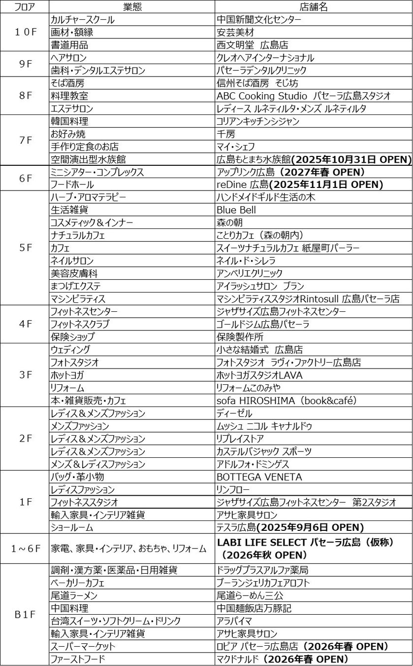 (参考)新生『パセーラ』 入居店舗一覧(今後の予定含む) ※2026年1月20日時点