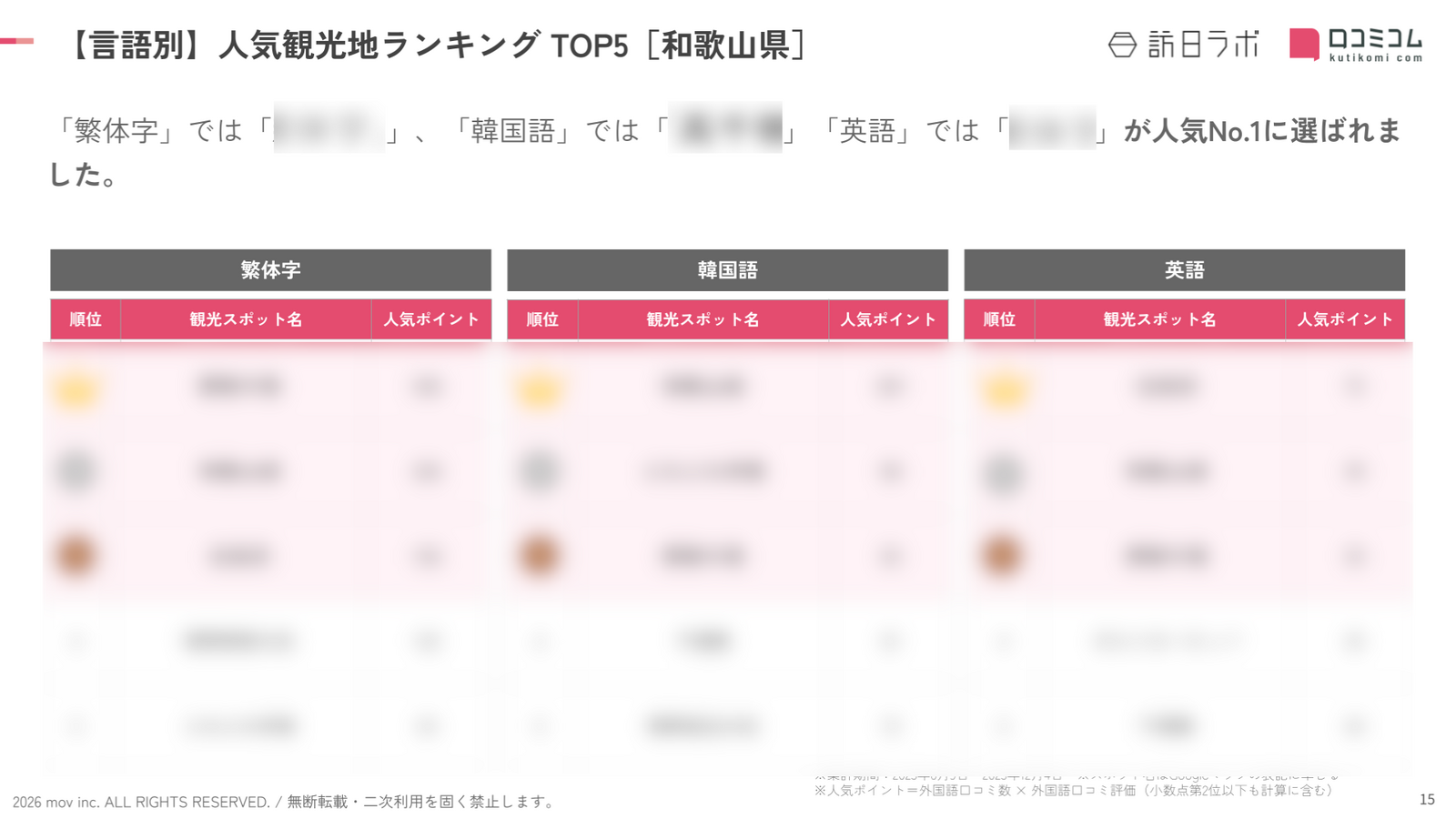 インバウンド人気観光地ランキング[和歌山県編]では、以下の内容が明らかになりました。