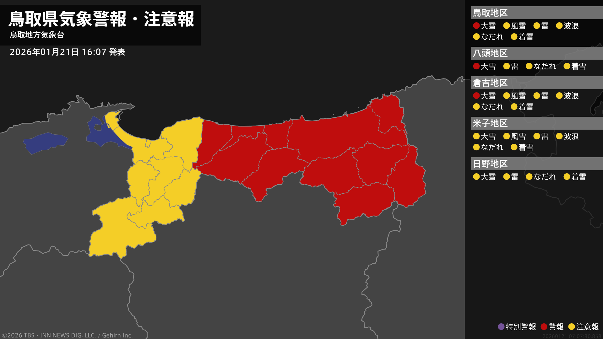 【大雪警報】鳥取県・鳥取市北部、鳥取市南部、倉吉市、岩美町、若桜町、智頭町などに発表 21日16:07時点