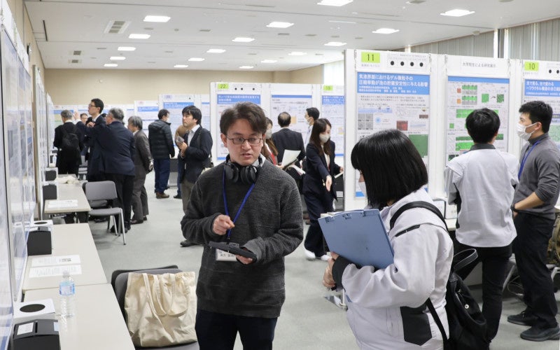 会場には78のブースを設け、本学の研究者・学生らが多様な研究シーズや社会実装に向けた取り組みを、ポスターや実物展示を用いて紹介しました。来場者からは専門的な質問や実用化に向けた意見が相次ぎ、会場各所で活発な議論が展開されました。