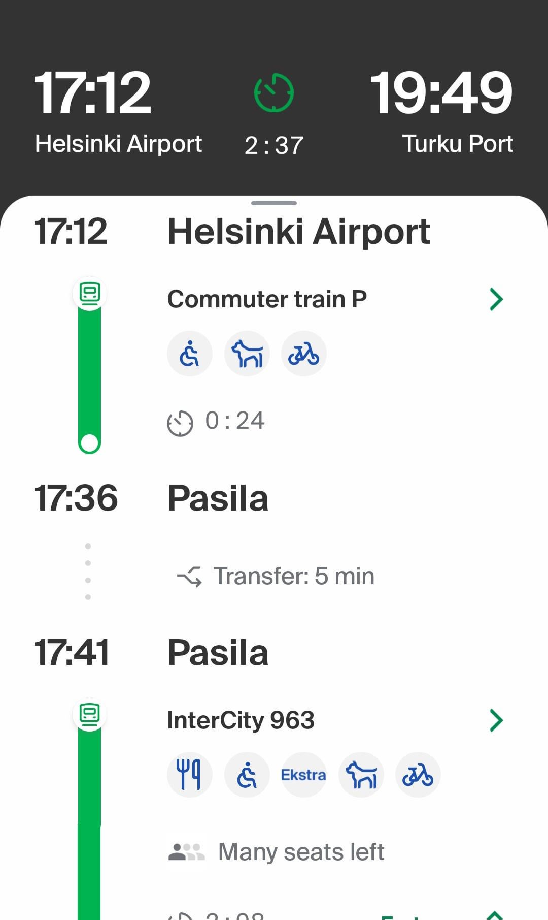 Twitter Pinterest Facebook Tumblr LinkedIn Bluesky Reddit Threads やあみんな!助けが必要です、お願いします!初めての海外旅行で、飛行機は午後 3 時半にヘルシンキに到着しますが、その日にトゥルクでクルーズする予定です。電車の時刻表はこれしか見つかりません。パシラでの接続は 5 分です。それで十分ですか?それとも電車に乗り遅れる危険がありますか? ご協力とご提案をいただきありがとうございます。チリからこんにちは! ❤️ Finland