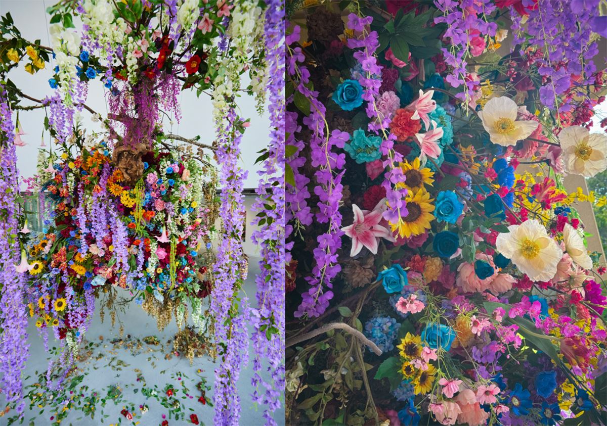 今回、蜷川とEiMが手がける天満宮・梅苑のインスタレーションでは、設置した1,000本以上のクリスタルと季節によって違う顔をもつ庭の風景とが自然光の中で溶け合い、変化し続けることで、作品そのものが呼吸するような「生きた体験」が生み出される。そして茶室を舞台とした作品では、咲き誇る花々と萎れて種へと変わっていく花々という対照的な表情の共存が、命の循環に潜む静かな輝きを感じさせるという。