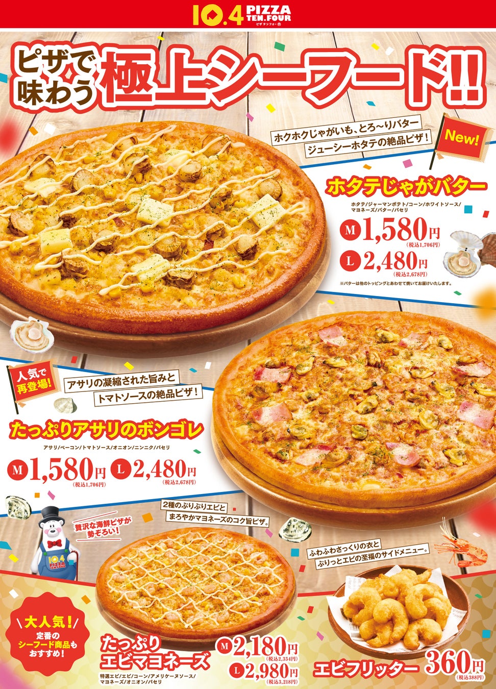 その他、定番の人気シーフード商品の2種のエビをトッピングしたピザ『たっぷりエビマヨネーズ』とふわふわさっくりな衣までおいしい『エビフリッター』もおすすめとなっております。