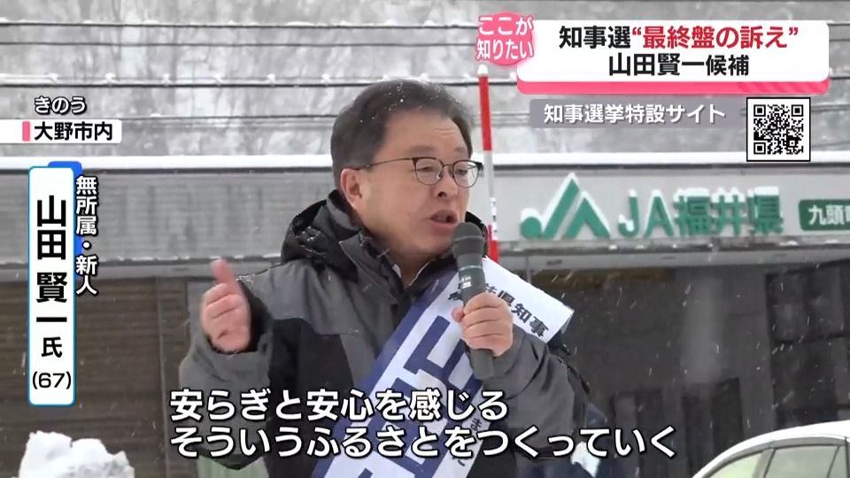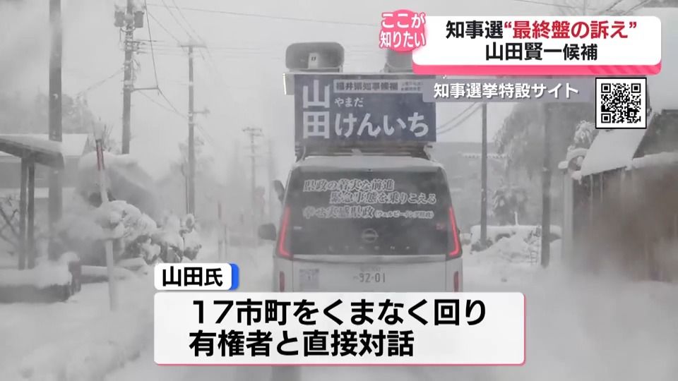 前越前市長の山田賢一候補は期間中、17の市や町をくまなく回り、有権者と直接顔を合わせるスタイルにこだわりました。