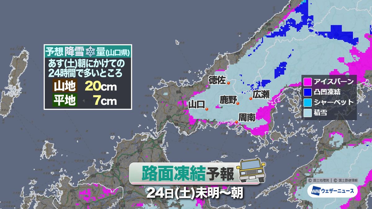 あす24日(土)朝にかけて24時間で降る雪の量は、県内は多い所で山地20センチ、平地7センチの見込みで、山間部は中部東部中心に靴が埋まるほどの積雪となる可能性があるほか、山口市中心部、そして瀬戸内側も積雪や凍結のエリアが広がってくる心配があります。