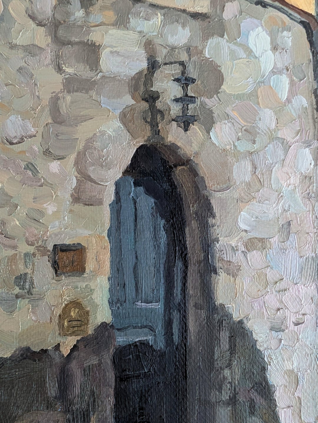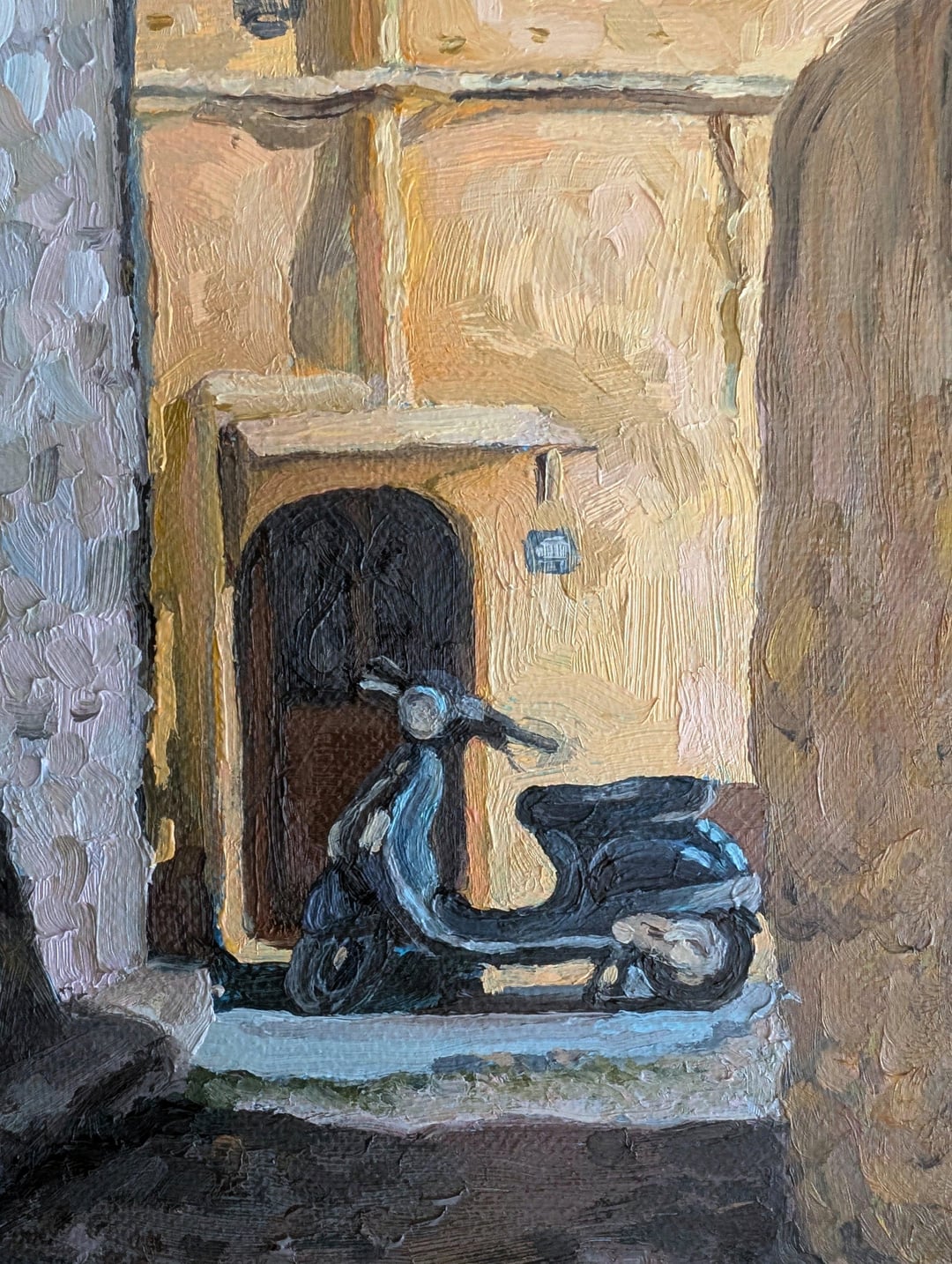 ギリシャ、晴れたロードス島にあるスクーターの油絵