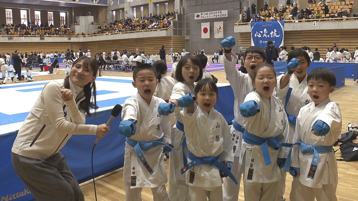 空手の競技力向上を目的とした大会が行われ、山梨をはじめ近隣の静岡や長野、神奈川など8県から小中学生約350人が参加。学年ごとに男女混合の団体戦を行い、武田信玄公の軍配をかたどった優勝杯を目指して熱戦を繰り広げました。