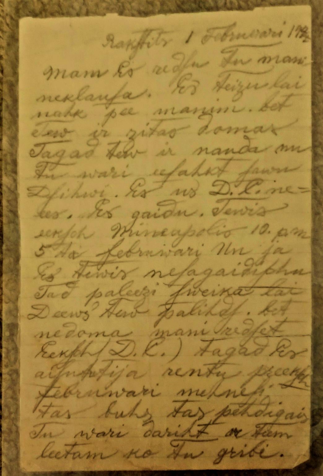 また、1940年代に書かれたと思われるラトビア語で書かれた手紙も持っています(日付は読みにくい)。名前はありません。翻訳してもらえませんでした。手書きは時代遅れで、一部の言葉はもう使われていないと言われています。 (もしこれが私の祖父母によって書かれたとしたら、1909 年代に書かれたであろうように書かれているのではないかと想像します。誰かがこの文章の読み方と翻訳方法を知っているかもしれない専門家を教えていただければ、とても感謝します。