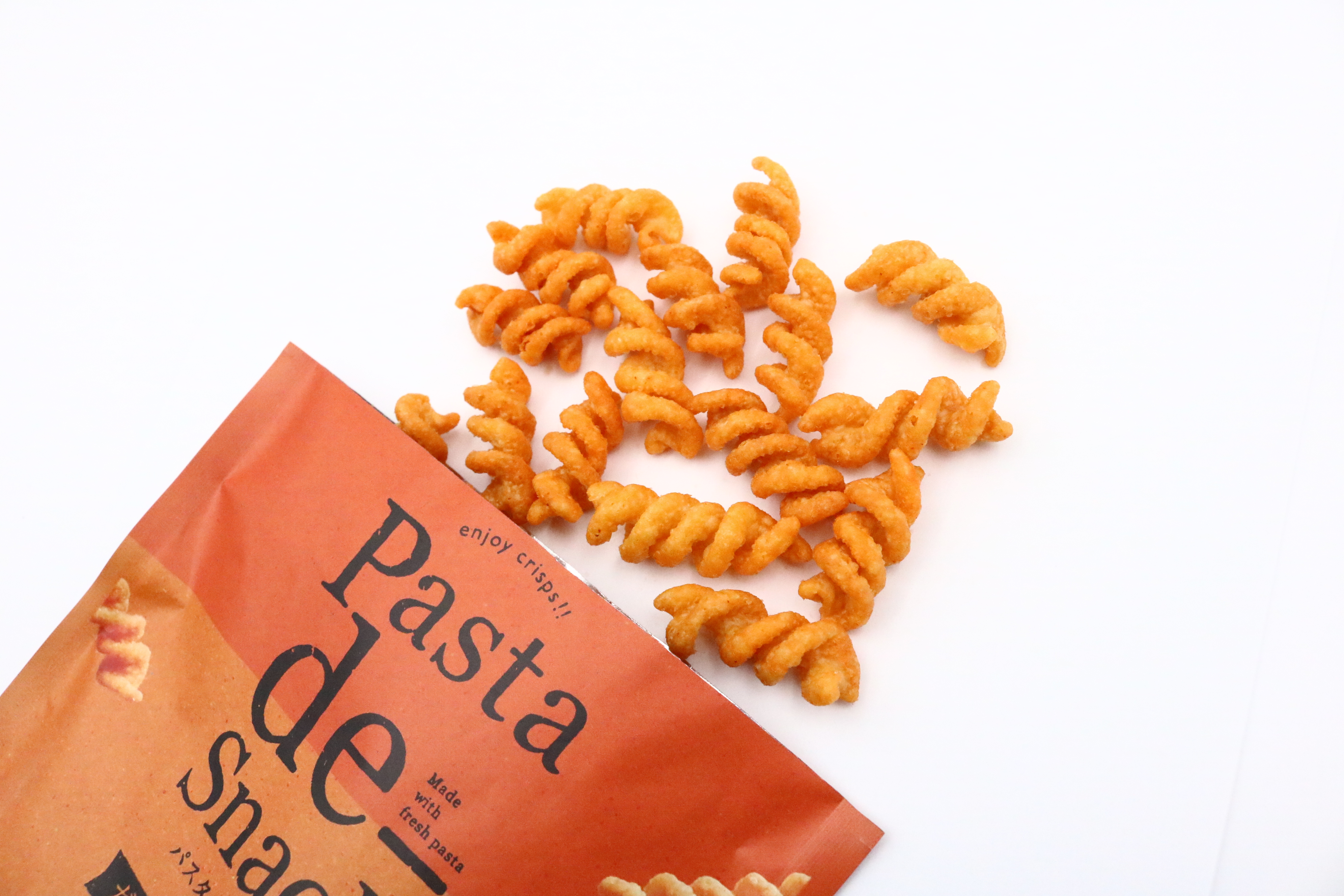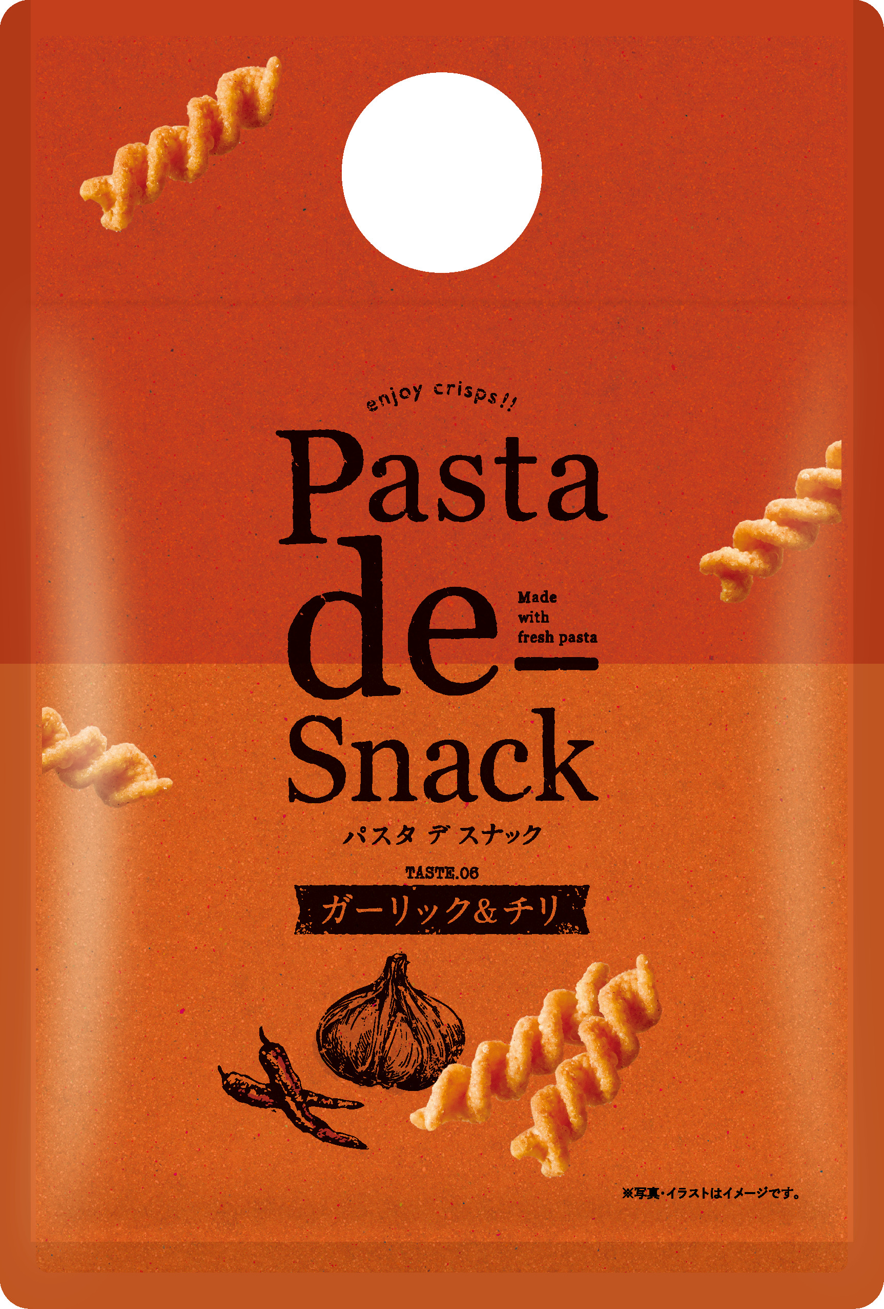 新商品「Pasta de Snack 06 ガーリック&チリ」は、ガーリックの濃厚な旨味とピリッとした辛さがクセになる味わいのスナックです。濃いめの味付けで、つまみやすいフジッリ型(螺旋状のショートパスタ)なのでお酒のおつまみはもちろん、ノンアルコールドリンクや幅広い飲料にも合わせやすい商品に仕上げました。これまでの定番ラインナップに“スパイシー”という新たな選択肢を加え、味のバリエーションを拡充致しました。