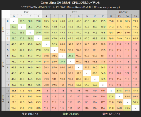 Core Ultra X9 388HのCPUコア間レイテンシは、Pコア同士やPコア~Eコア間のレイテンシが比較的低い数値である一方、Eコア同士やEコア~LP-Eコア間のレイテンシは比較的大きなものとなっている。