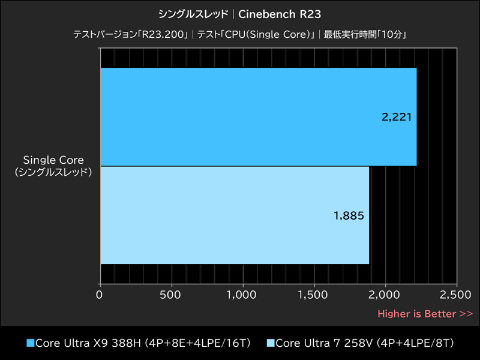 Core Ultra X9 388Hはマルチスレッドで「19,365」、シングルスレッドでは「2,221」を記録。Core Ultra 7 258Vのスコアをマルチスレッドで約98%、シングルスレッドで約18%上回った。