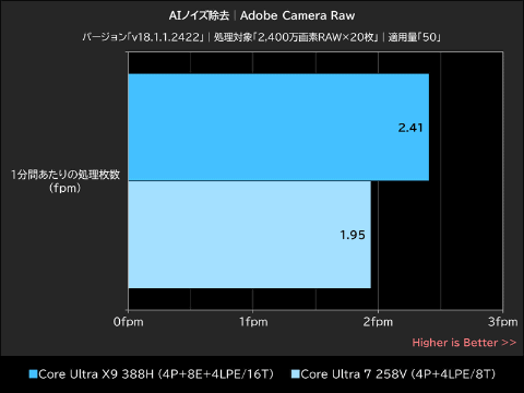 もっぱらGPUで処理を実行するAIノイズ除去において、Core Ultra X9 388H(Arc B390)が記録した処理速度は「2.41fpm」。これはCore Ultra 7 258V(Arc 140V)が記録した「1.95fpm」を約24%上回るものだ。
