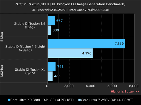 GPUを使用した画像生成において、Core Ultra X9 388H(Arc B390)は、Stable Diffusion 1.5(fp16)で約97%、Stable Diffusion 1.5 Light(w8a16)で約71%、Stable Diffusion XL(fp16)で約61%、それぞれCore Ultra 7 258V(Arc 140V)を上回った。