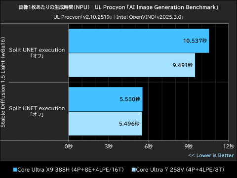 ここではCore Ultra X9 388HがCore Ultra 7 258Vを下回る結果となっており、Split UNET execution「オフ」で約10%、Split UNET execution「オン」では約1%、いずれもCore Ultra 7 258Vのスコアを下回った。