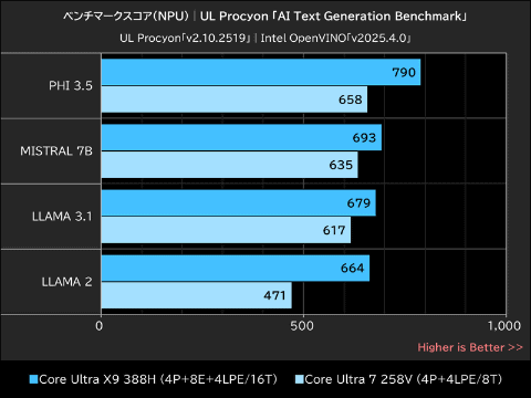NPUを使用したテキスト生成でのCore Ultra X9 388Hは、PHI 3.5で約20%、MISTRAL 7Bで約9%、LLAMA 3.1で約10%、LLAMA 2で約41%、それぞれCore Ultra 7 258Vを上回った。