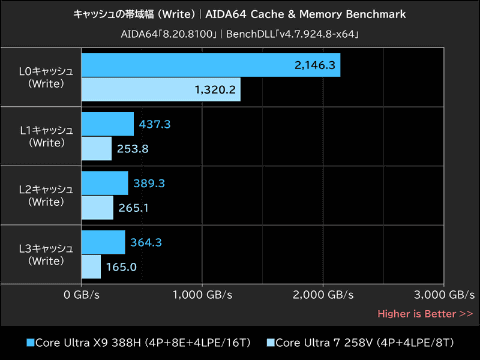 CPUコア数で勝るCore Ultra X9 388Hのキャッシュ帯域幅は、Readで16~188%、Writeで47~121%、Copyで28~120%、それぞれCore Ultra 7 258Vを上回った。基本的にコア数が多い方がキャッシュの帯域幅は増加するので、この結果は必ずしも設計変更による性能向上を示しているわけではない。