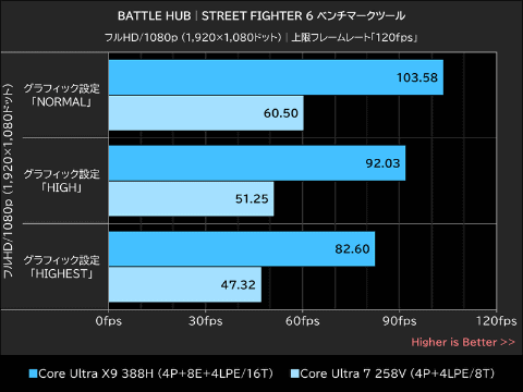 60fpsが上限のメインコンテンツであるFIGHTING GROUNDにおいて、Core Ultra X9 388Hはすべてのグラフィックスプリセットで上限の60fpsを維持するパフォーマンスを発揮。HIGH以上のグラフィックス設定では、顕著なフレームレート低下を生じたCore Ultra 7 258Vを13~20%上回った。