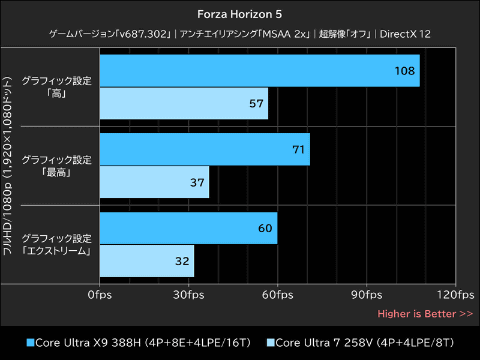 Core Ultra X9 388Hは、グラフィックス設定=高で「108fps」、最高で「71fps」、エクストリームで「60fps」を記録。Core Ultra 7 258Vを88~92%上回った。