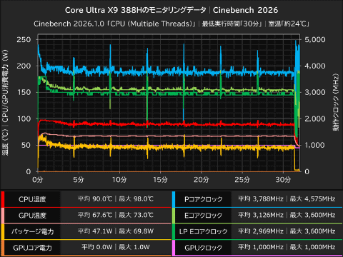 HWiNFO64 Proを使って計測したCinebench 2026「CPU (Multiple Core)」実行中のモニタリングデータをまとめたものが以下のグラフ。テスト時の室温は約24℃で、Cinebenchの最低実行時間は30分。