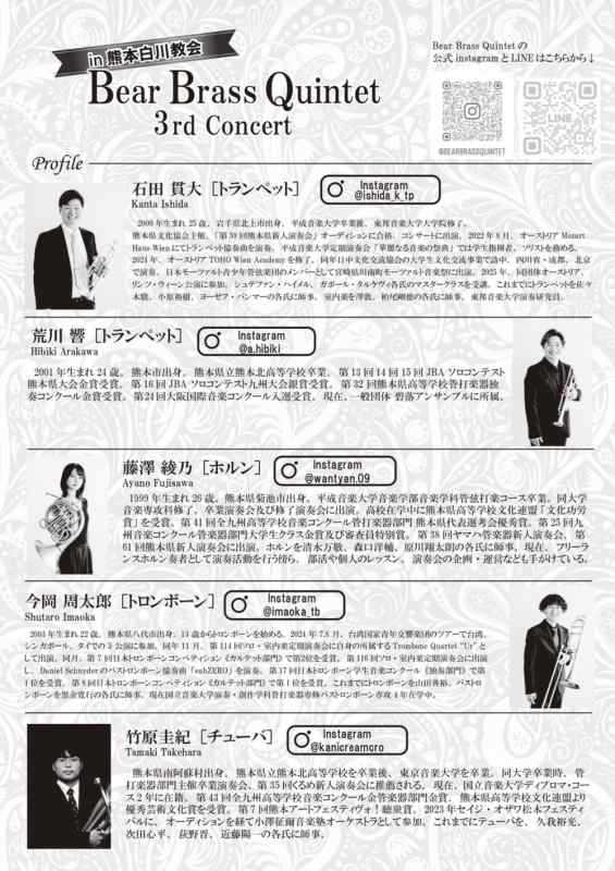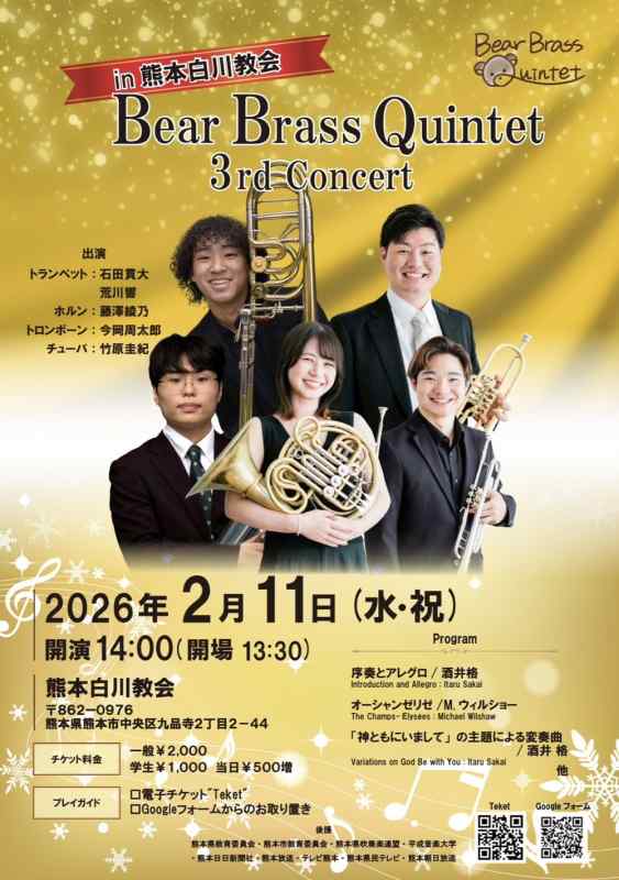 熊本にゆかりのある若手演奏家による金管五重奏のコンサート。酒井格「序奏とアレグロ」やM・ウィルショー「オーシャンゼリゼ」などを披露する。出演はトランペットの石田貫大さんと荒川響さん、ホルンの藤澤綾乃さん、トロンボーンの今岡周太郎さん、チューバの竹原圭紀さん。
