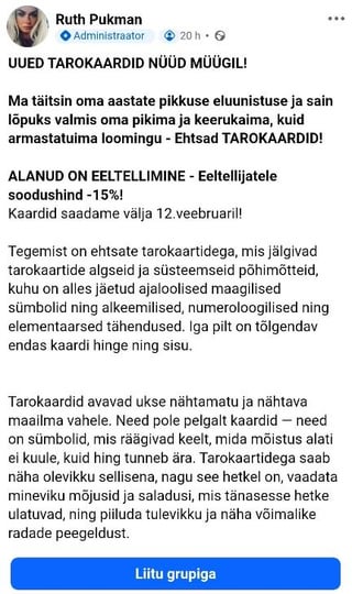 Facebookで "光の天使たち" ルース・プクマンという名前で活動するルース・プクマンは、わずかなお金で AI アートを人々に販売することに成功しており、すべてを自分の手で描いたと強く主張しています。 "とても早く働きました" 🙂 彼女のグループ内でそれが AI の創作物である可能性があるという事実について話した場合、グループからは即座に追放され、ルースからはブロックされます。 Estonia
