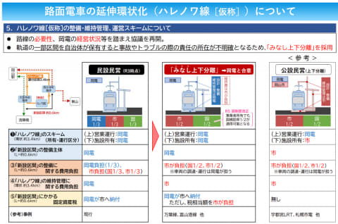 こうした背景から、路線の必要性や岡山電気軌道の経営状況を踏まえたうえで協議を行なった結果、「みなし上下分離」を採用。国と市が負担する路線整備費のほか、日常維持管理費についても市が負担する方式として岡山電気軌道の負担を軽減する。