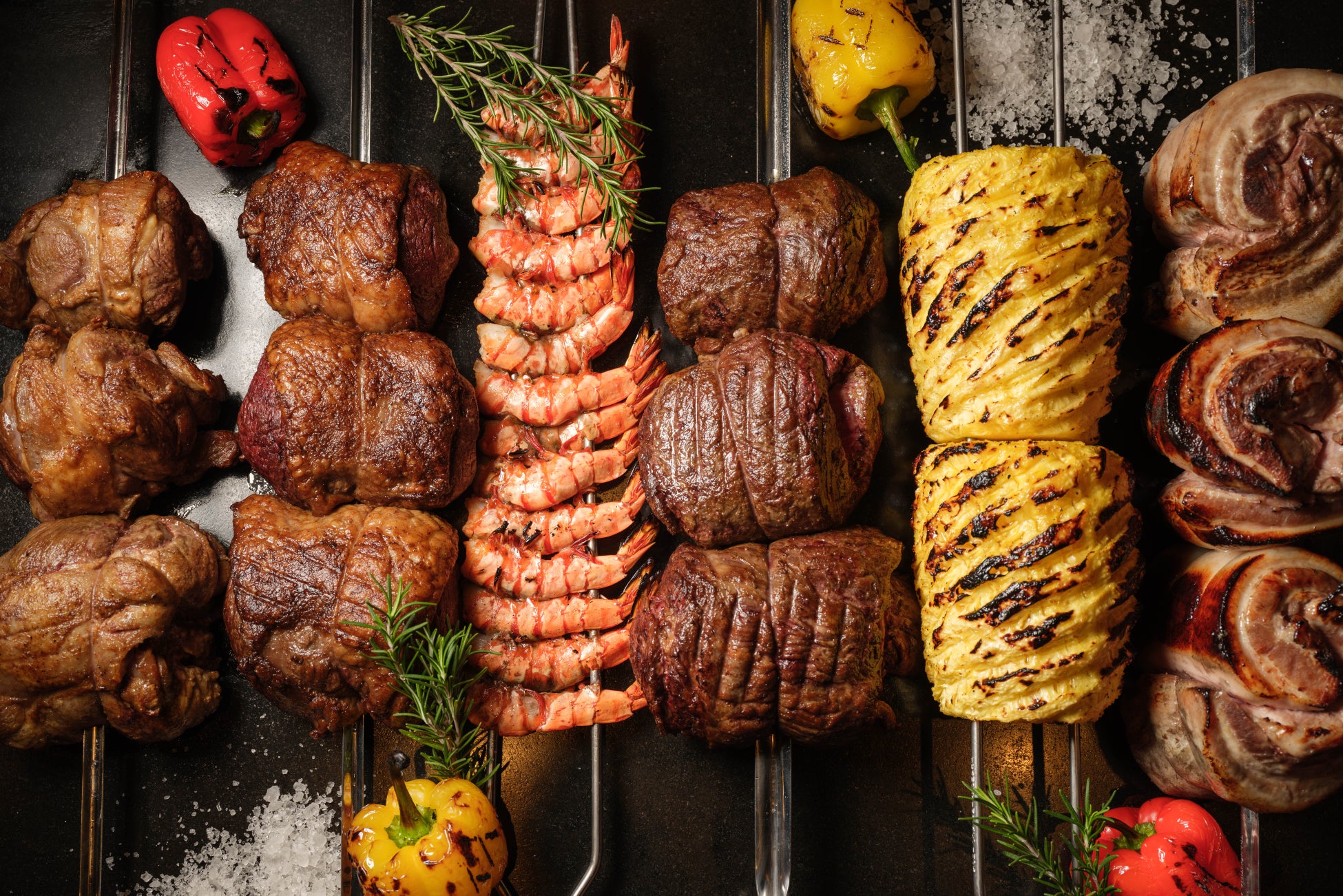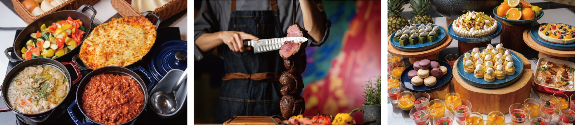 上質な肉塊をダイナミックに串刺しにしてショーキッチンでグリルし、焼き立てをゲストの目の前でカットするシュラスコスタイルのメインディッシュは、牛肉の希少部位イチボやカイノミ、ラム肉、豚肉、鶏モモ肉などが揃います。シンプルな味つけでジューシーに仕上げ、肉本来の旨みを引き出しつつ、能登塩や金沢柚子胡椒味噌、万能ソース“ビナグレッチモーリョ”、“サルサ”をはじめ全11種のバラエティ豊かなソースとともに、様々なテイストで堪能できるのも魅力です。また、ペルーを代表する魚介のマリネ“セビーチェ”、地中海沿岸発祥の“エスカベッシュ”など、多国籍なメニューも多彩に並びます。ひよこ豆をペースト状にした中東料理のひとつ“フムス”はクリーミーな食感とコクが特長で、野菜にディップしても美味しい“ワカモレ”といったヘルシーなアイテム、シーザーサラダを自分好みでカスタマイズできるセクションにもご注目を。さらに、牛すじを煮込んだブラジルスタイルのスープ、アメリカ・テキサス州の郷土料理“チリコンカン”など食欲をそそる温かい料理もラインアップするほか、“マンゴーのムース”や“グリルパインタルト”等7種のデザートもお見逃しなく。