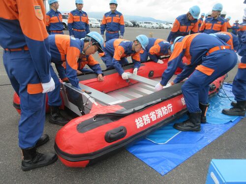 嘉瀬分団の団員らが参加して行われた水防訓練=2025年5月、佐賀市嘉瀬町の嘉瀬川防災ステーション