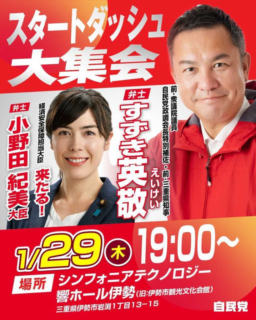 1月29日(木)小野田紀美 経済安全保障担当大臣に駆けつけていただき、勢いをさらに加速させる「すずき英敬 スタートダッシュ大集会」(総決起大会)を開催します。