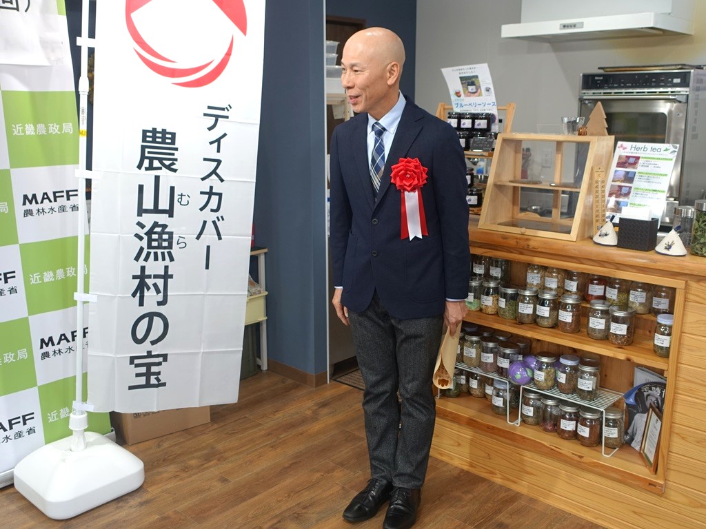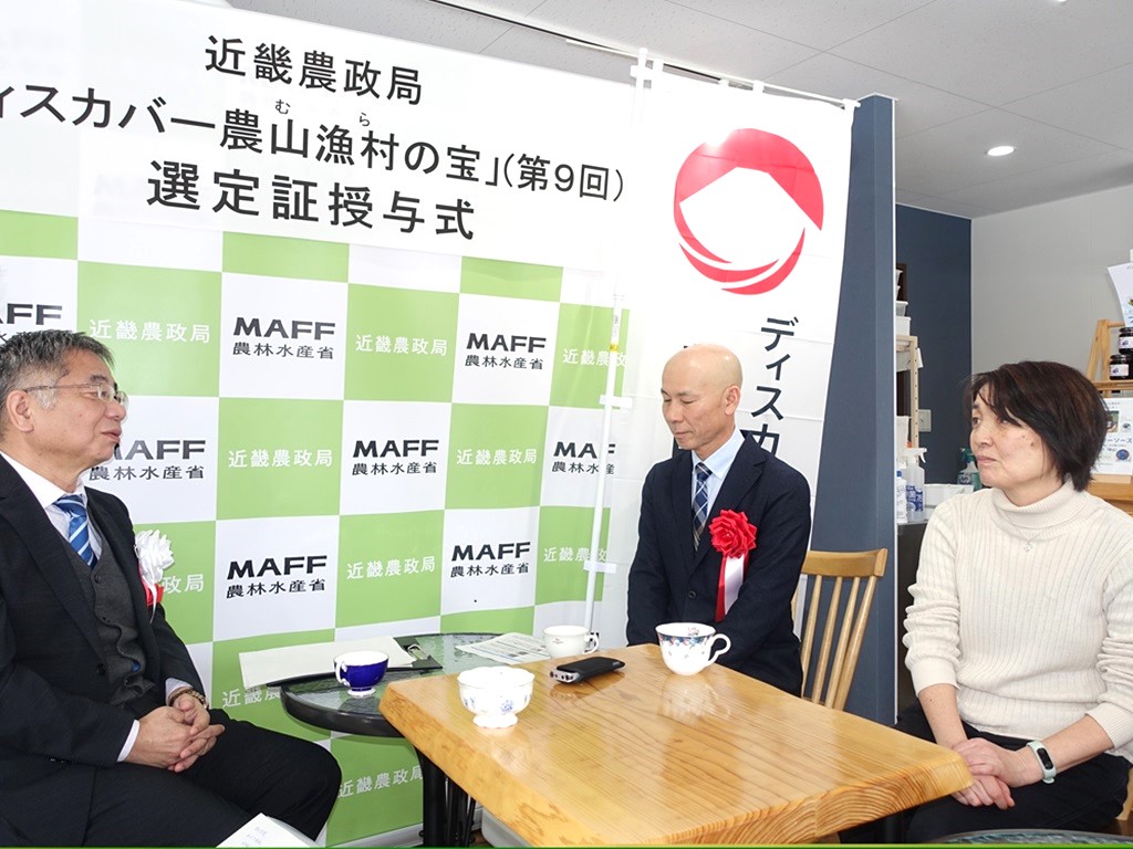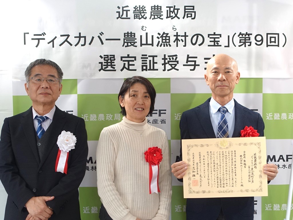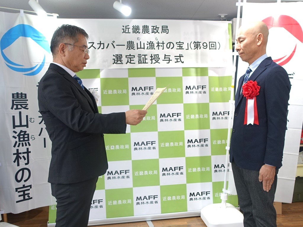 近畿農政局京都府拠点の吉田地方参事官から、株式会社Muroji-farmに選定証を授与しました。