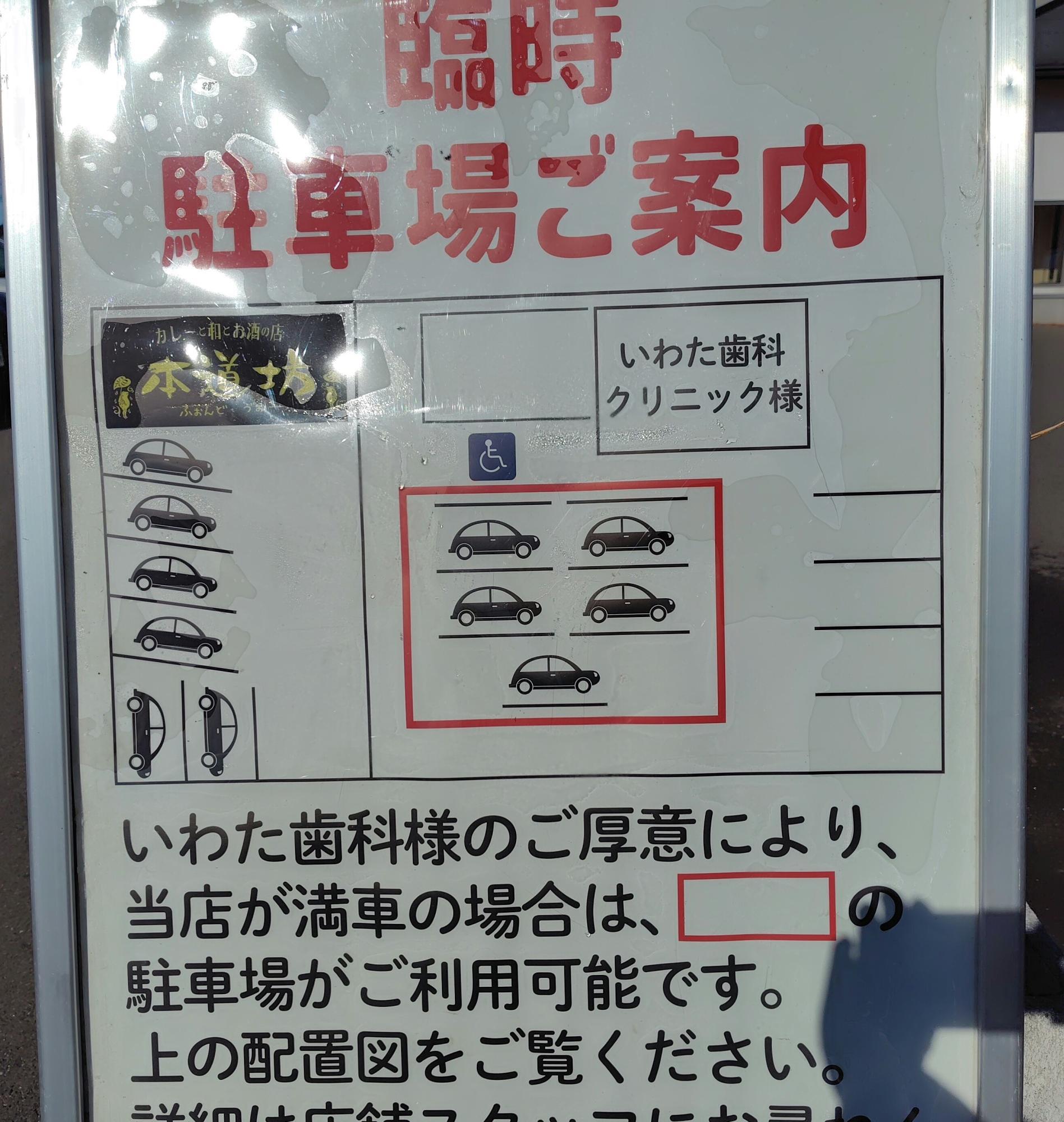 駐車場のご案内です。お店の前が満車だった場合、お隣のいわた歯科様のご厚意で、赤で囲った場所の駐車場が利用可能だそうです。こういったお心遣い、とても嬉しいですね。