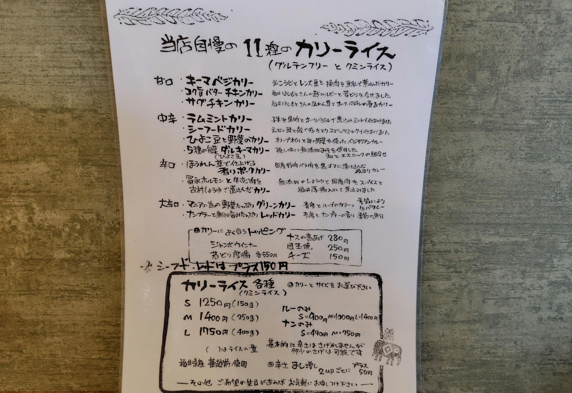 「キーマベジカリー」「シーフードカリー」「ラムミントカリー」など味も甘口や中辛、辛口、大辛口までいろいろあります。お店の方によると、フランスの岩塩を使用していて、素材を活かす形で調理されています。カレーはグルテンフリーで、添加物不使用だそうです。