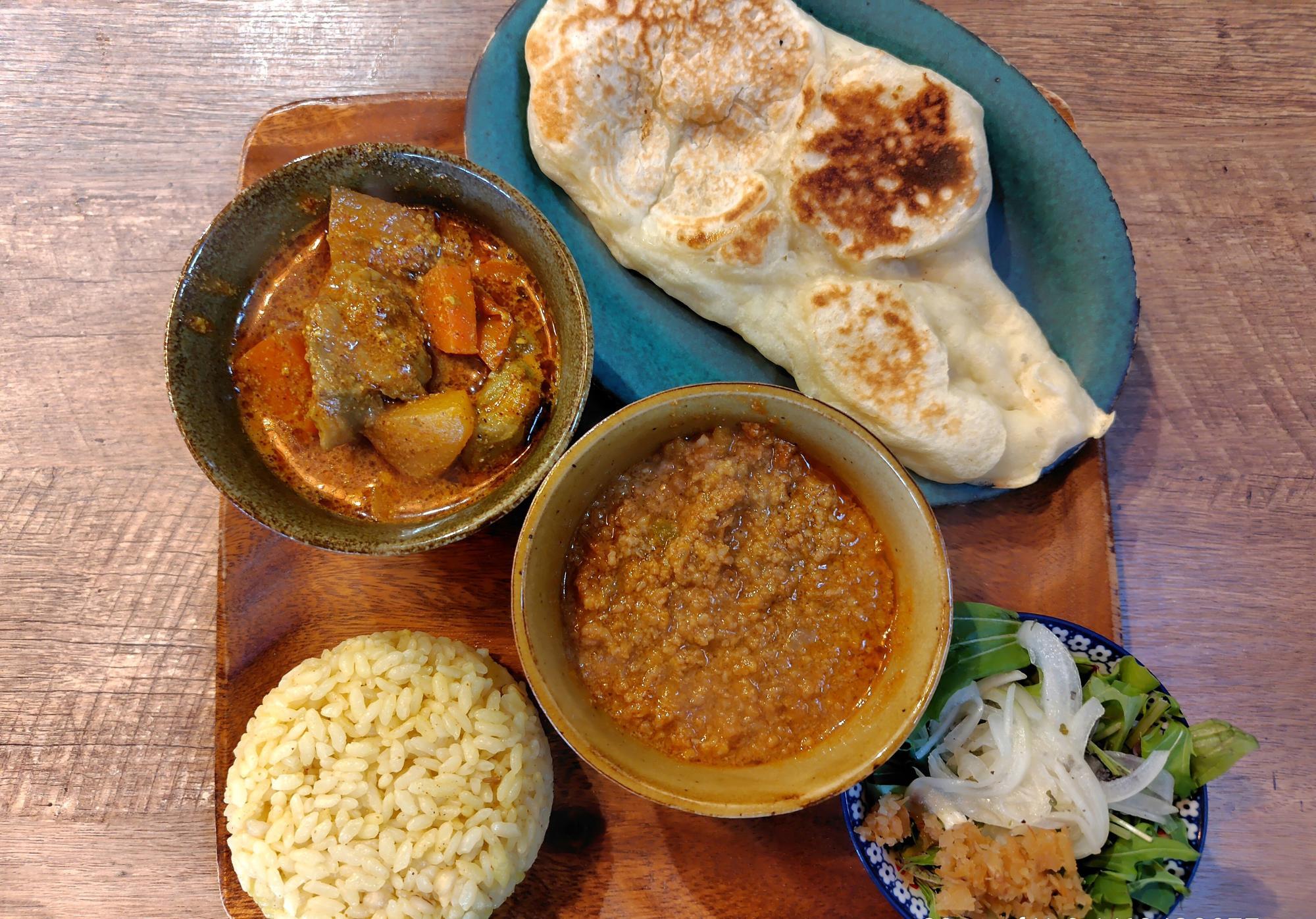 「ちょこっとアジアめし」をチョイス。カリーは「キーマベジカリー」と「ラムミントカリー」を選びました。こちらのナンは、とてももっちりして、他のお店にはない素敵な食べごたえでした。店主の方に美味しさの秘密をお聞きしたら、小さなナンを作りたかったということで水不使用、ヨーグルト、はちみつ、砂糖、卵で作られているそうです。サラダのベビーリーフはシャキシャキしていてとても美味しかったのです♪ハシモトさんという農家と年間契約をされていると教えていただきました~。