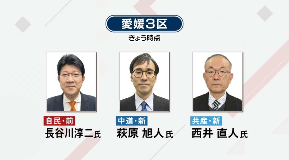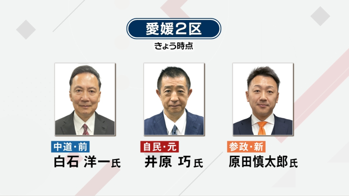 松山市以外の中予地区と南予地区が選挙区の愛媛3区は、3度目の当選を目指す自民党・前職の長谷川淳二さんに、中道改革連合・新人の萩原旭人さんと、共産党・新人の西井直人さんが挑む構図が見込まれています。