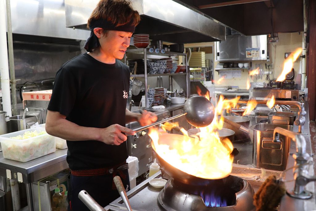 中華鍋で炎をあげる調理法が味噌ラーメンの味を決める(杉浦美香撮影)