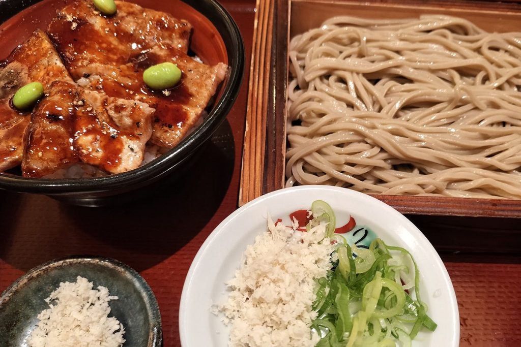 豚丼とソバ。山ワサビで食べるのが蝦夷前流だ(杉浦美香撮影)