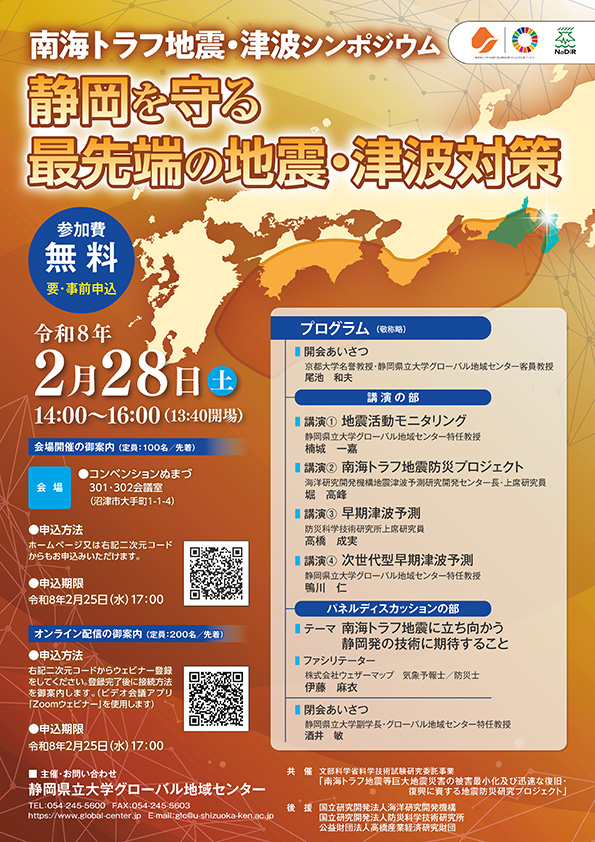 グローバル地域センターは、シンポジウム「南海トラフ地震・津波シンポジウム~静岡を守る最先端の地震・津波対策~」を開催します。