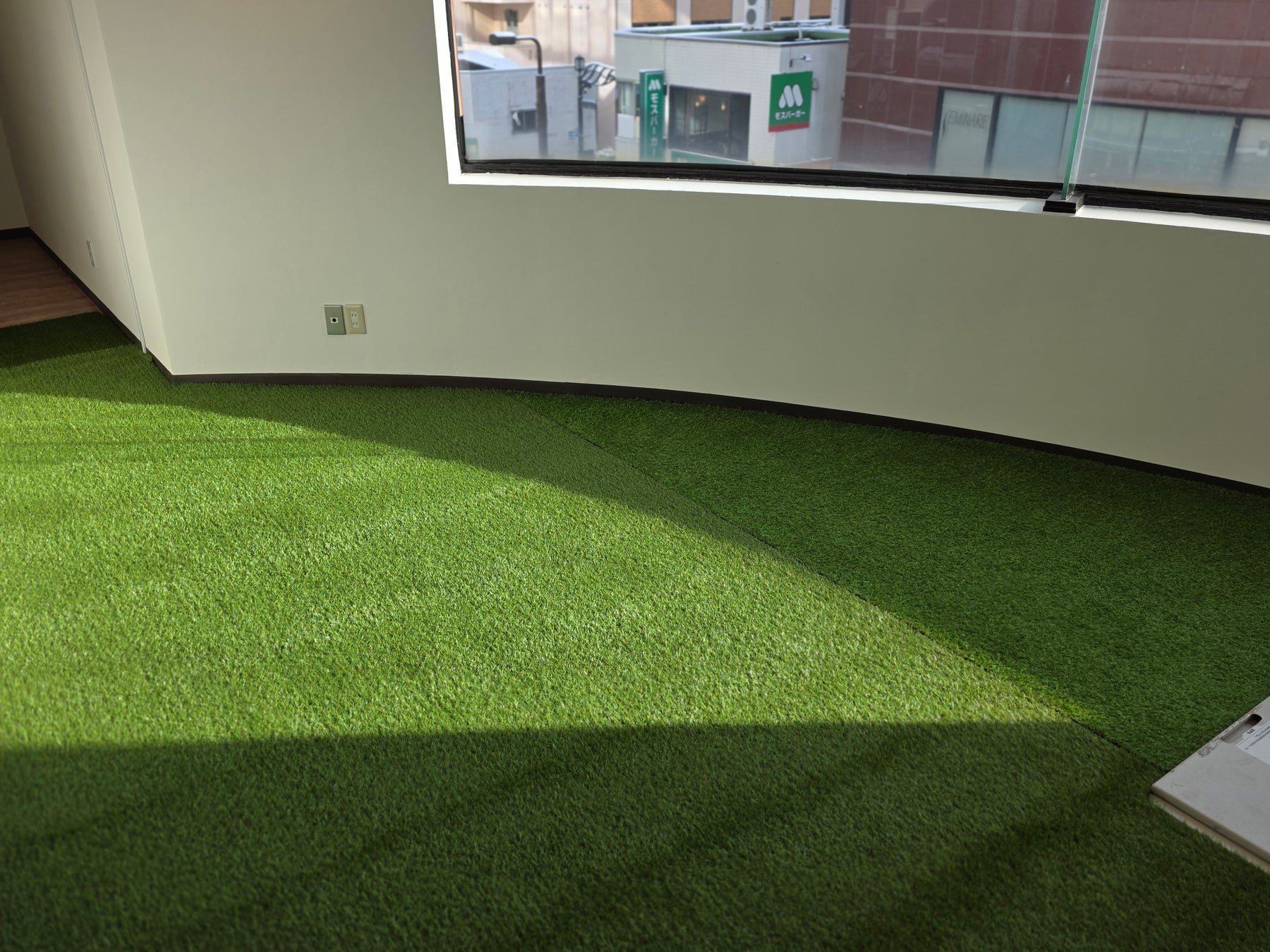 靴を脱いでリラックスできる芝生エリアを完備。長時間のデスクワークで凝り固まった脳と身体を物理的にリセットできる空間です。